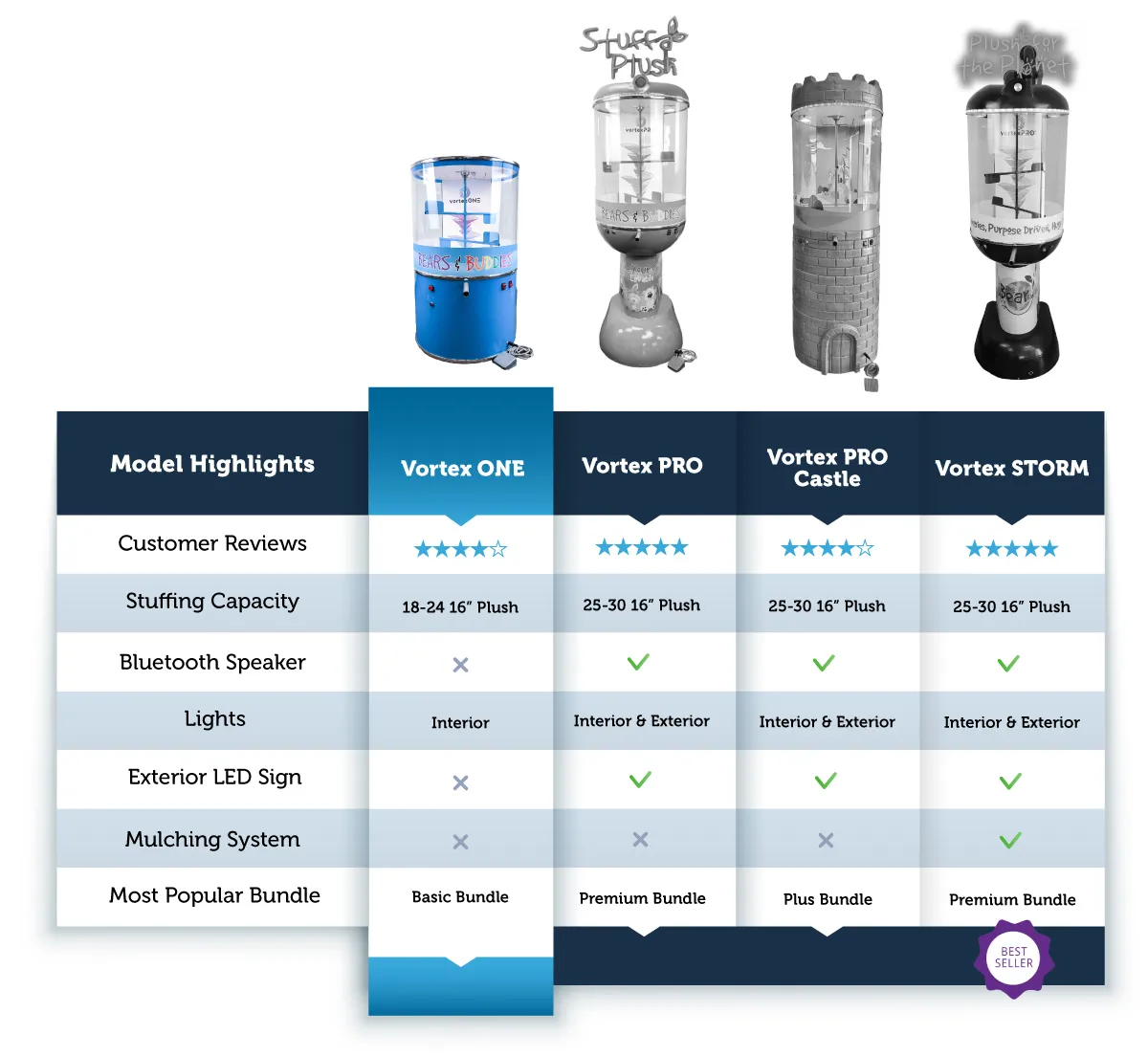 The Vortex One Premium Business Bundle gives you an opportunity to establish yourself as a premier portable provider in the Build-A-Plush space. This bundle provides you with a $5000 store credit that never expires and can be used as you need. You also receive your Vortex One stuffing machine with stock interior lights and patent pending Vortex mulching system. This is a great option for an already established business who is looking to add plush to their product offering or a hungry entrepreneur looking to establish a name for themselves.